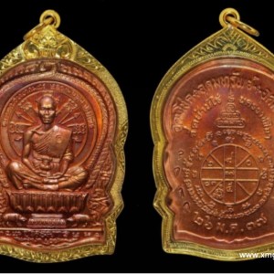 纯金版,发行199尊,是以套装形式发行,一套5枚,包含纯金,纯银,九宝铜,黄铜,以及红铜,这一套里的每一尊背面的编号以泰语雕刻,如下图纯金背面数字是泰语的20,与普通版的阿拉伯数字有所区别:龙婆坤 2537 骑猪自身佛牌